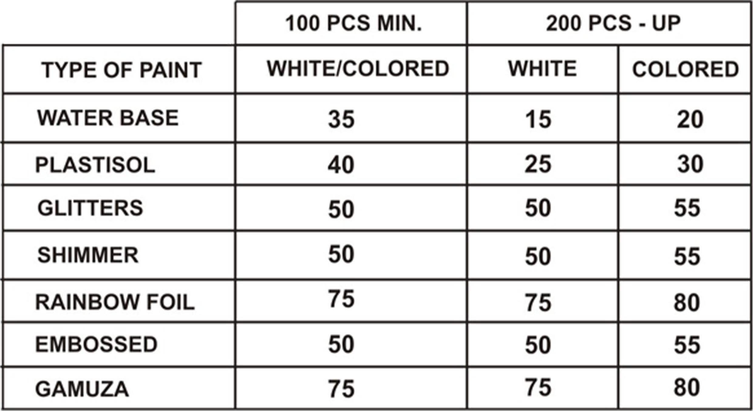 ● Add Php10 per additional color ● Below min. add screen charge - Php 350 /screen